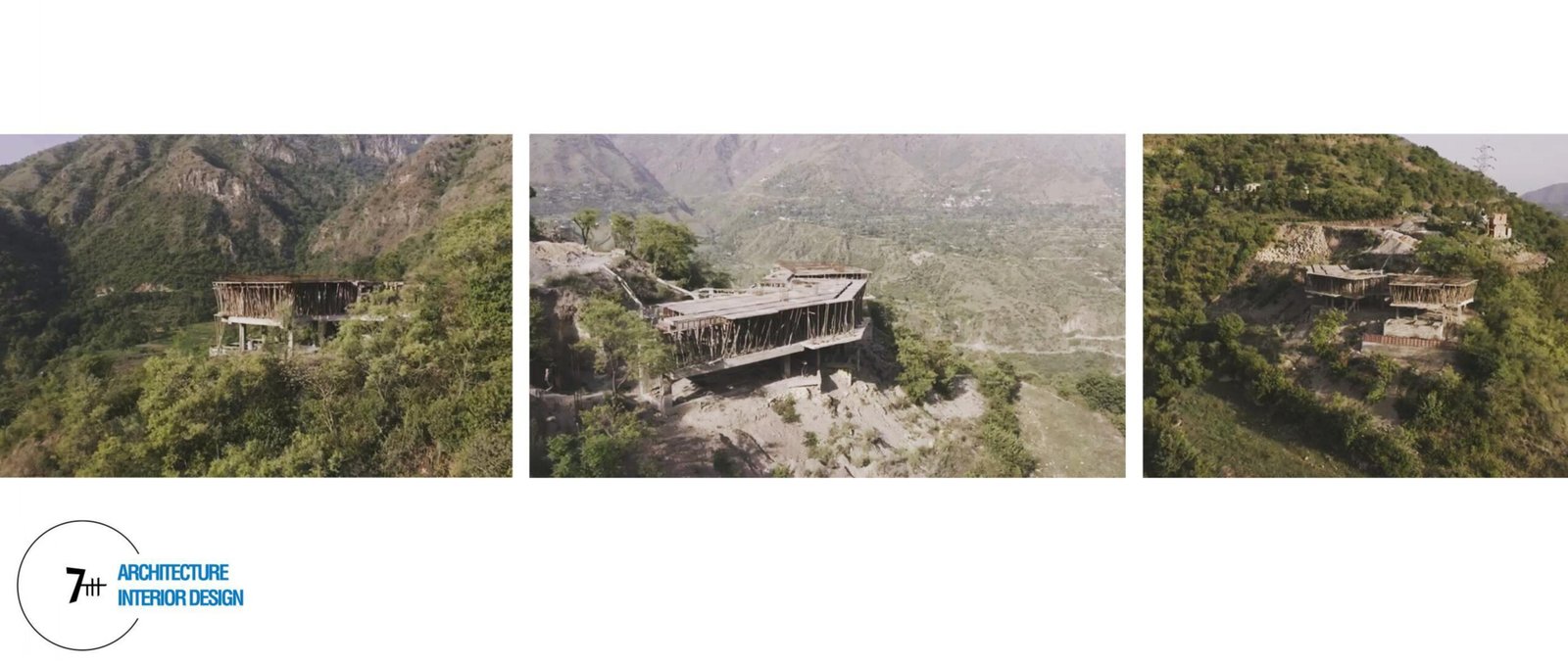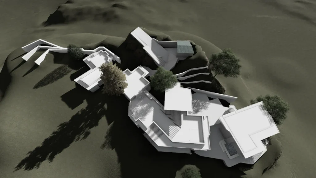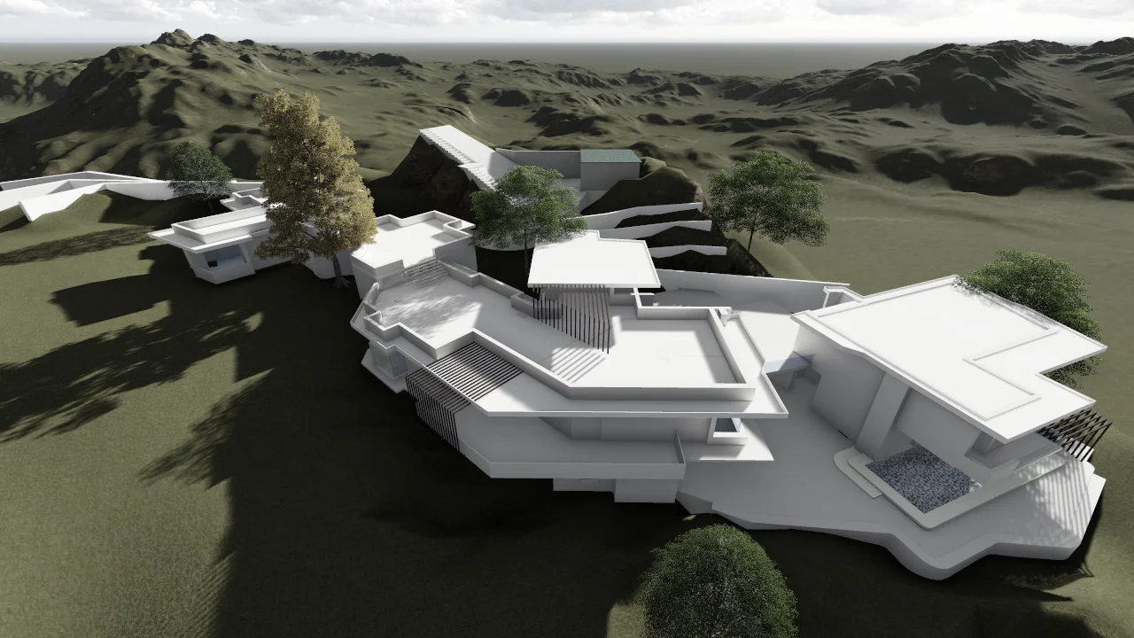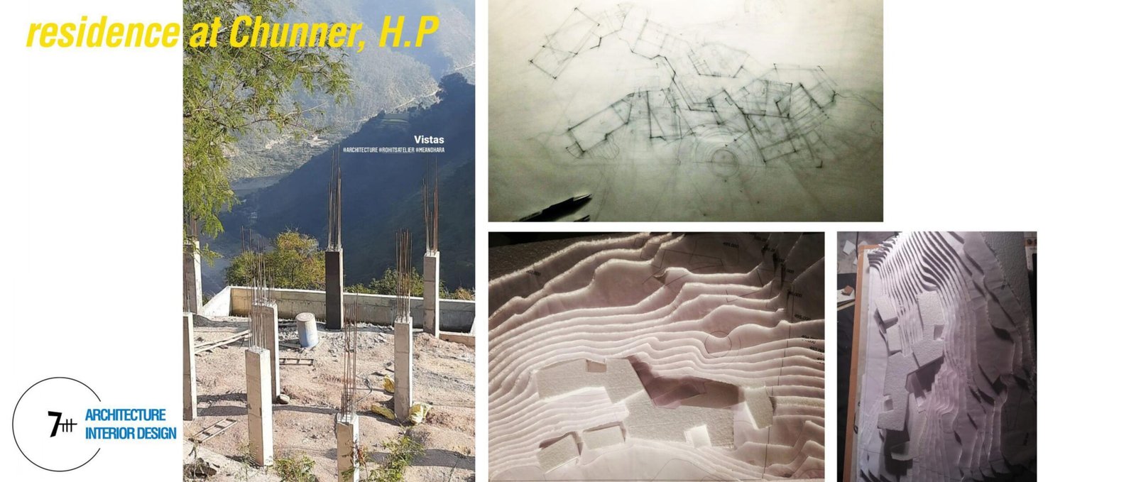 The architecture though part of the hill is highlighted by lines which dictate a flow across the site and the contours where each space tries to orient itself to the sun-path and the views. The entrance is a pause which on one side leads to the kitchen and dining facility, climbing a few steps above while the walls have been accommodated to incorporate 2 existing trees on either side. Since the kitchen and the dining with its spill over become a point of interaction and act as an extension of a living room, the space along the linear form occupies its own identity. Towards the left of the entrance we cross the drawing-living spaces where the lower ground supports the carefully worked out structure network.